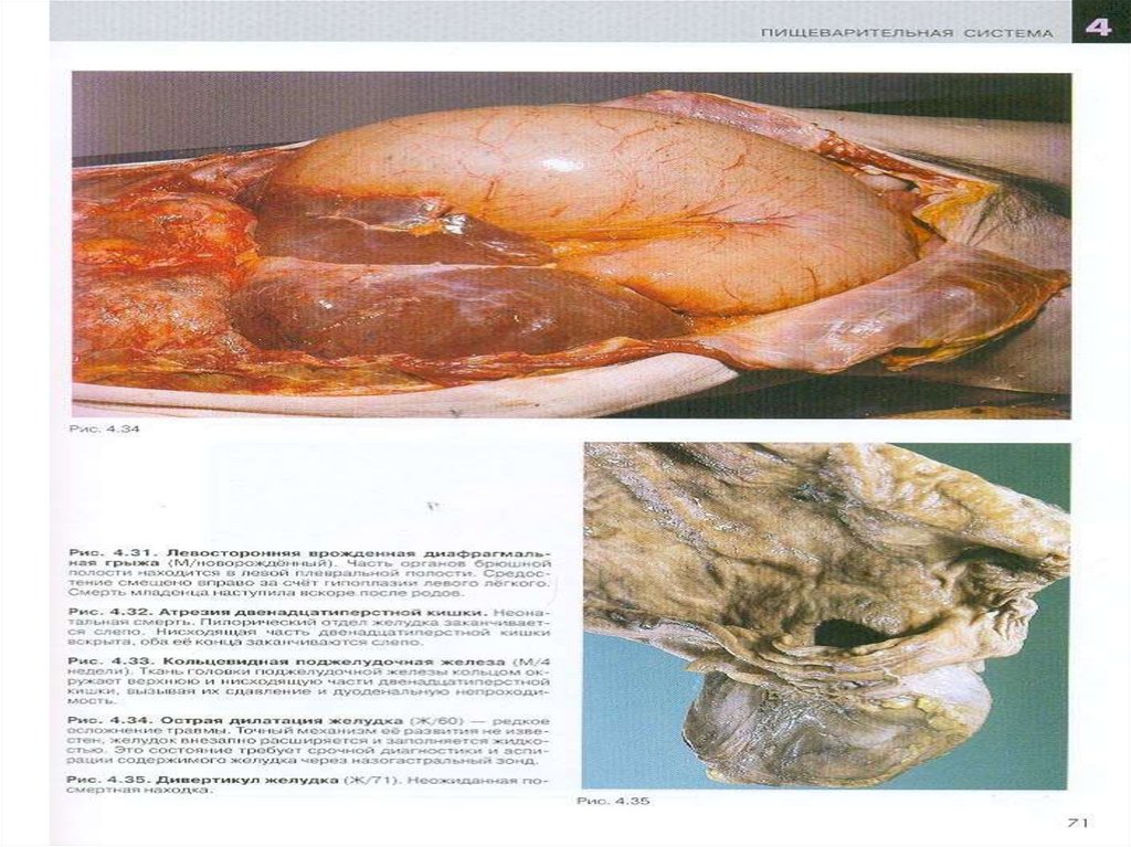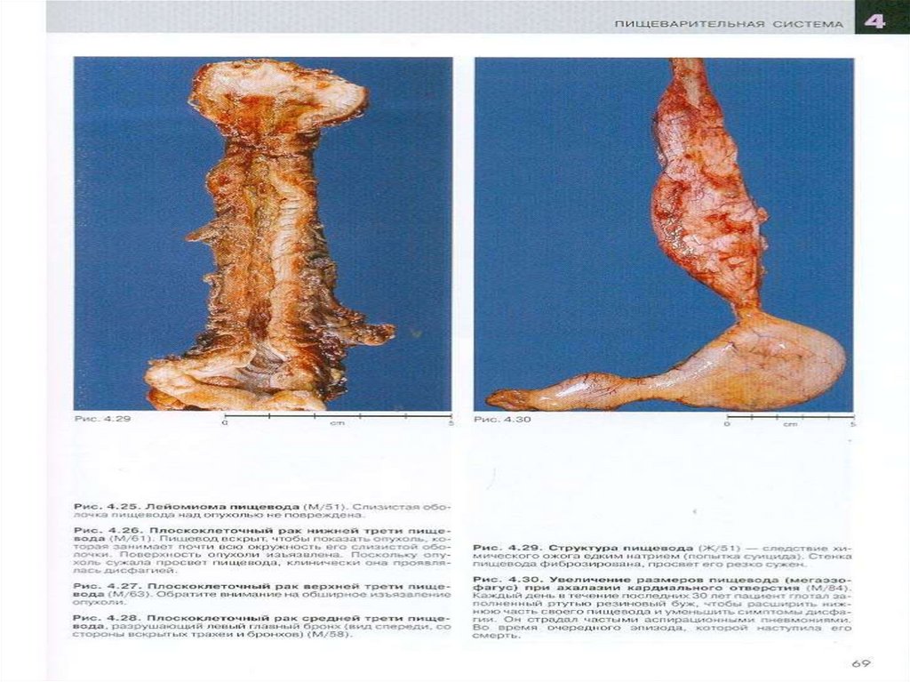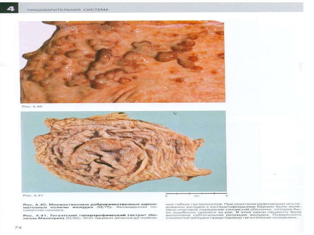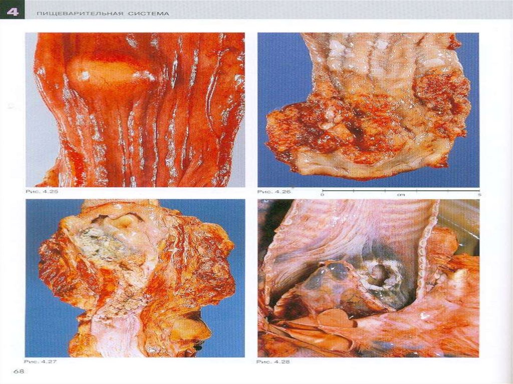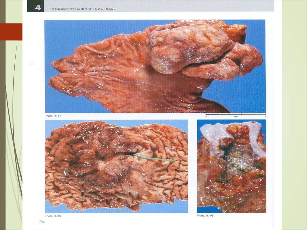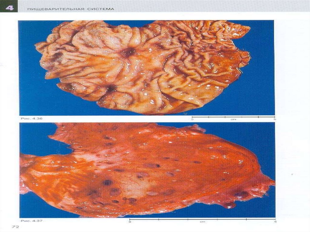 99. Диффузный рак желудка с эрозиями в слизистой оболочке (рисунок слева) и прорастанием ее опухолью (рисунок справа).