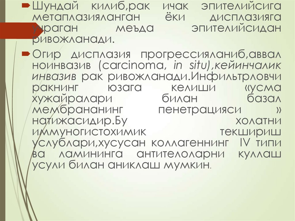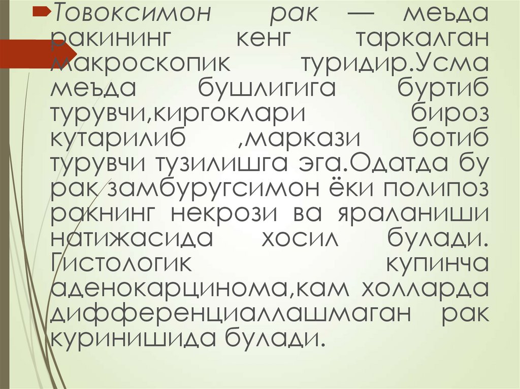 Диффуз рак — макроскопик формаси булиб,кучли эндофитусиш билан характерланибмеъда деворига усиб кирувчи окишкулранг