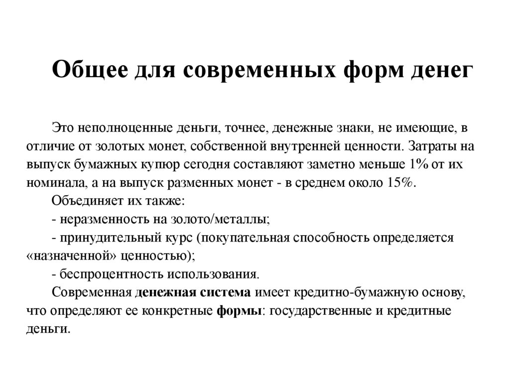 Общее для современных форм денегЭто неполноценные деньги, точнее, денежные знаки, не имеющие, в