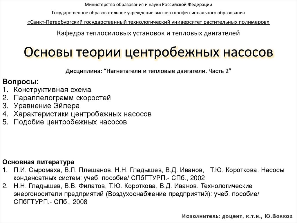 Исполнитель: доцент, к.т.н., Ю.Волков