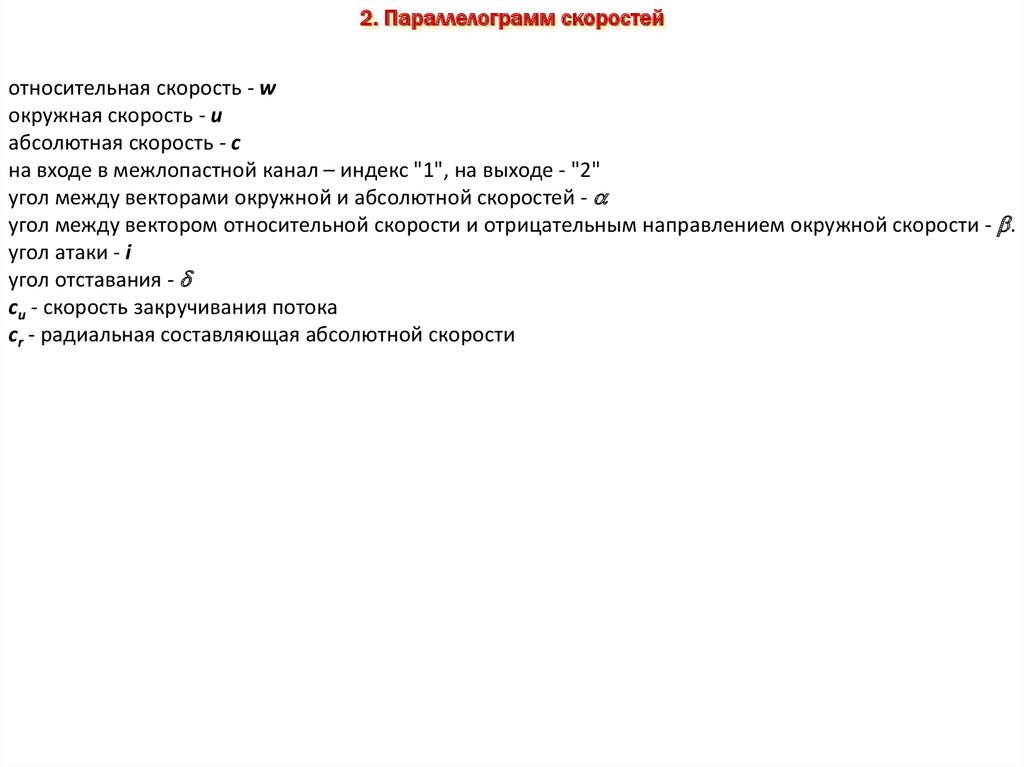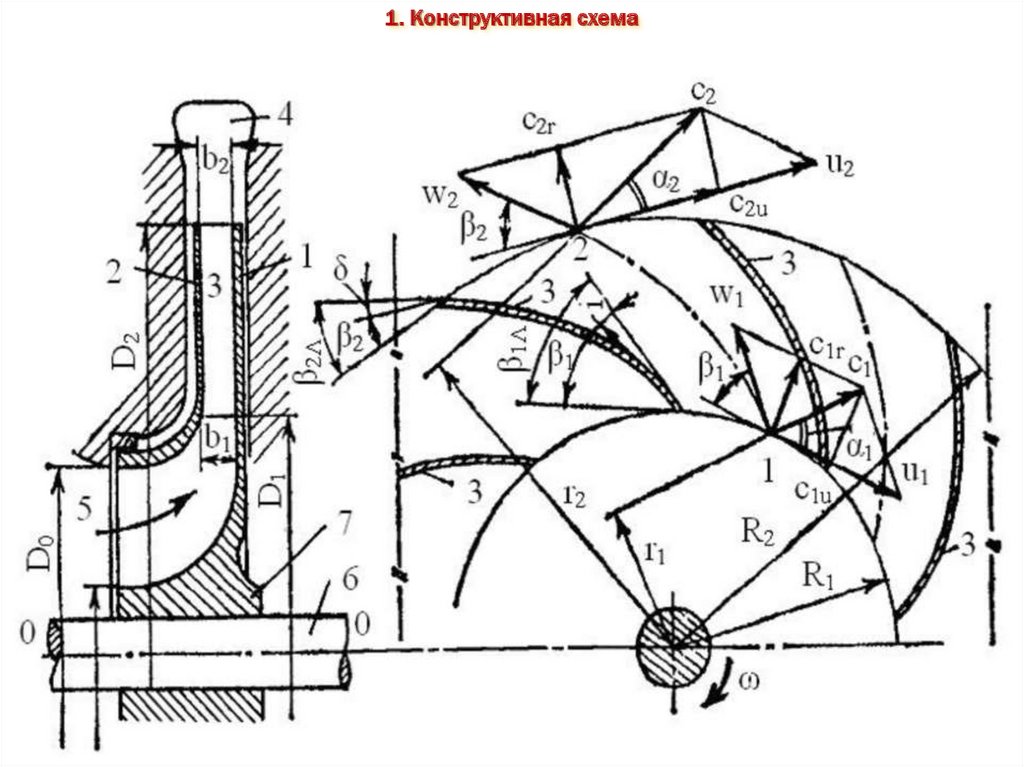 на входе в межлопастной канал – индекс "1", на выходе - "2"