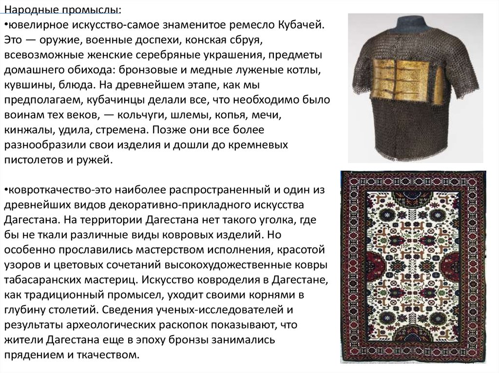 Народные промыслы:•ювелирное искусство-самое знаменитое ремесло Кубачей.
