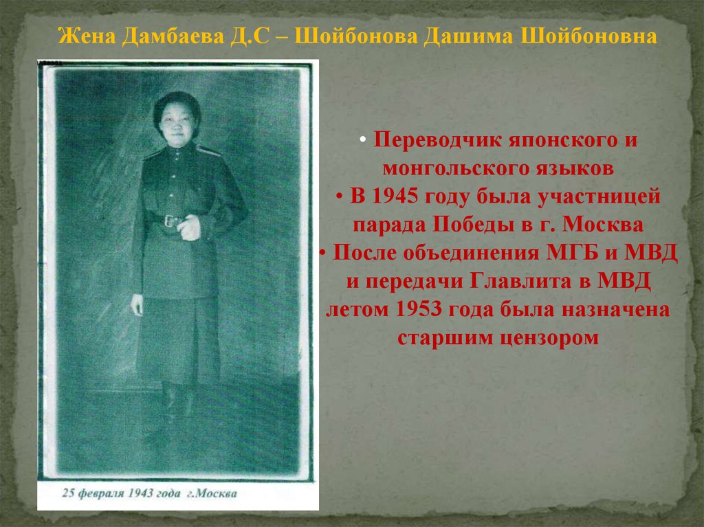 Жена Дамбаева Д.С – Шойбонова Дашима Шойбоновна• Переводчик японского и