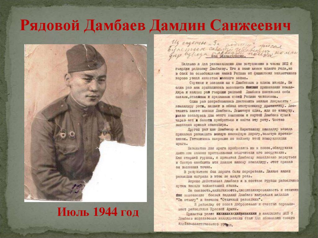 Рядовой Дамбаев Дамдин СанжеевичИюль 1944 год
