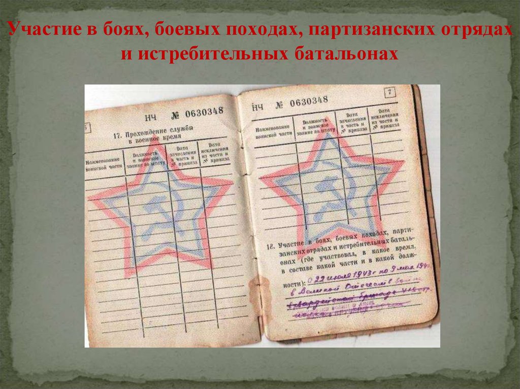 Участие в боях, боевых походах, партизанских отрядахи истребительных батальонах