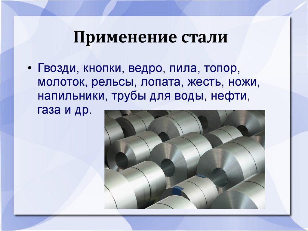 Применение сталиГвозди, кнопки, ведро, пила, топор,