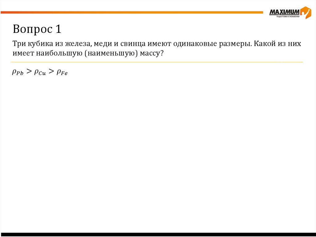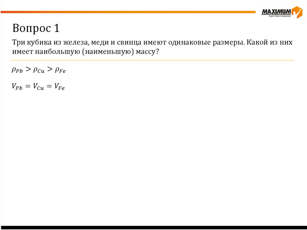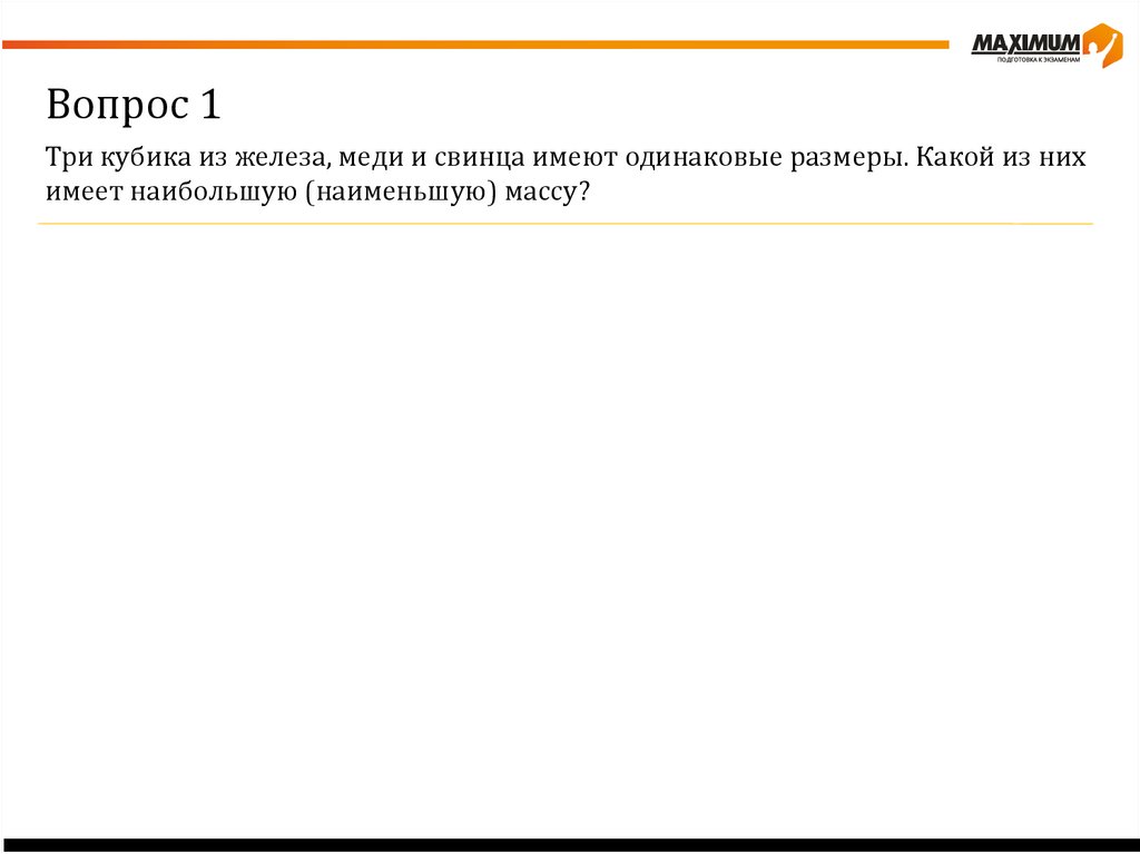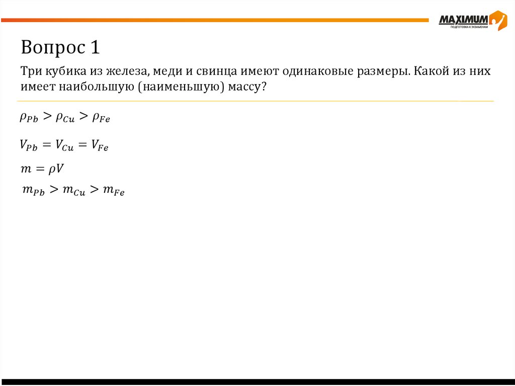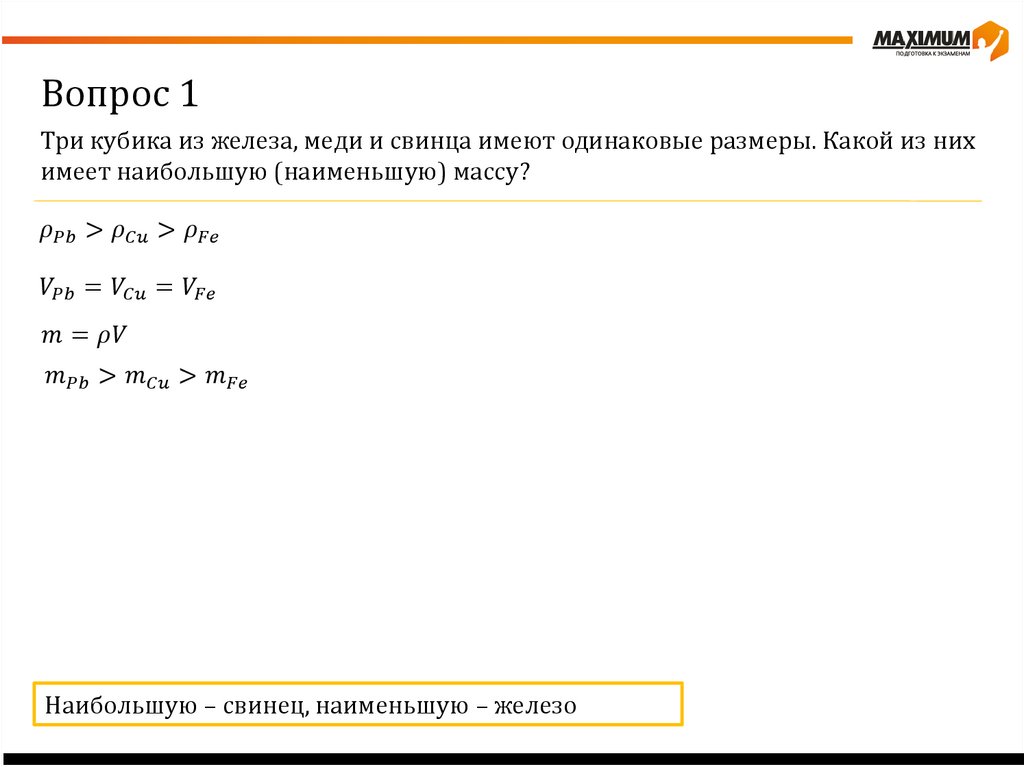 Вопрос 1Три кубика из железа, меди и свинца имеют одинаковые размеры. Какой из них