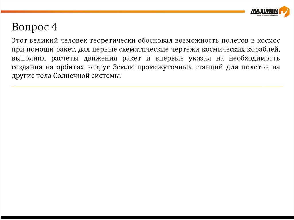 Вопрос 4Этот великий человек теоретически обосновал возможность полетов в космос