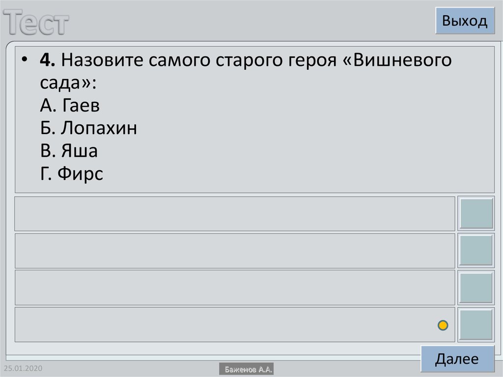 Выход• 4. Назовите самого старого героя «Вишневого