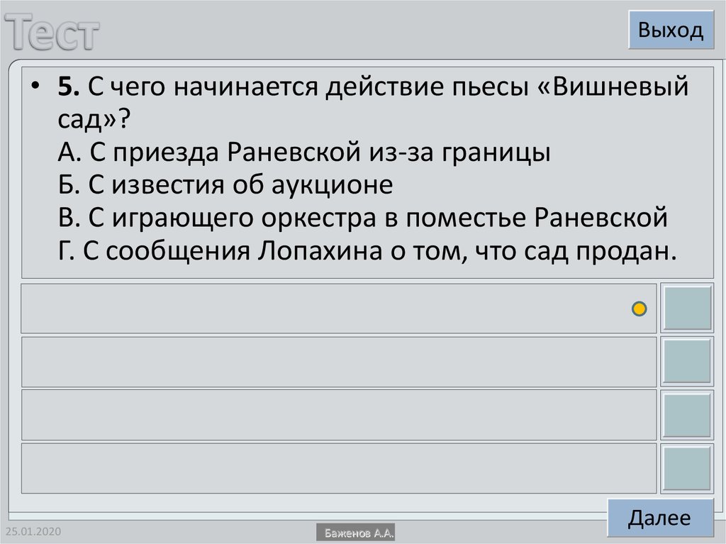 Выход• 5. С чего начинается действие пьесы «Вишневый