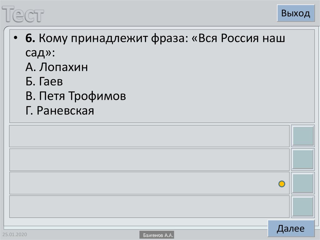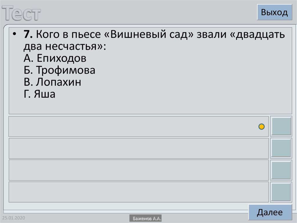 Выход• 7. Кого в пьесе «Вишневый сад» звали «двадцать