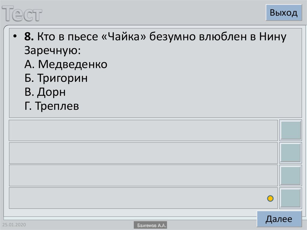 Выход• 8. Кто в пьесе «Чайка» безумно влюблен в Нину