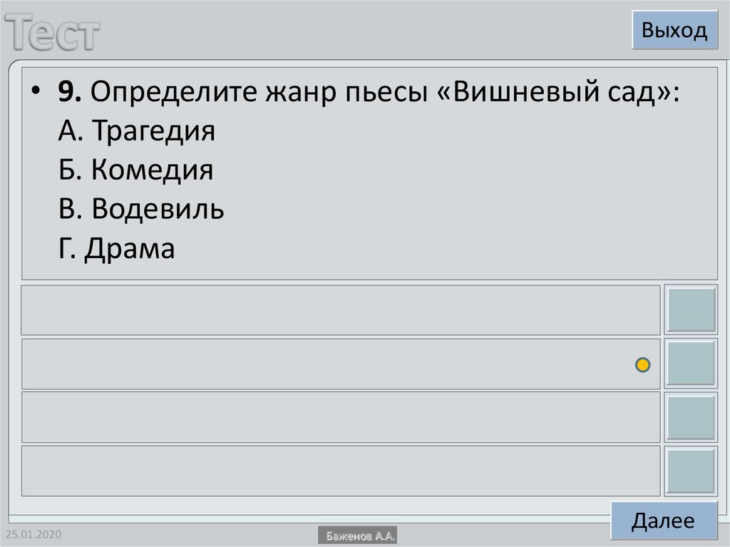 Выход• 9. Определите жанр пьесы «Вишневый сад»: