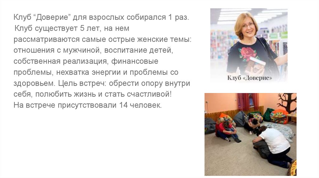 Клуб “Доверие” для взрослых собирался 1 раз.Клуб существует 5 лет, на нем