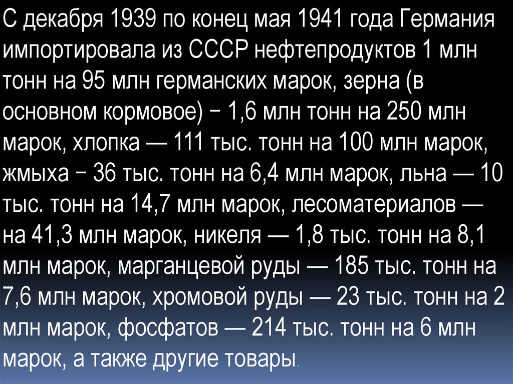 С декабря 1939 по конец мая 1941 года Германияимпортировала из СССР нефтепродуктов 1 млн