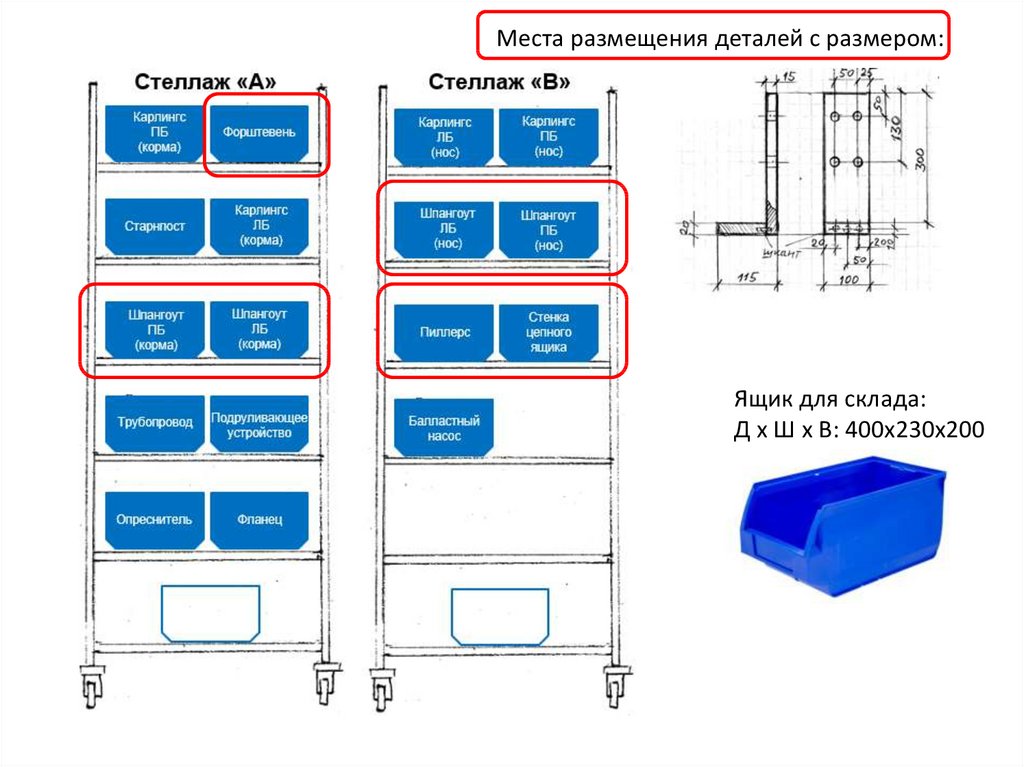 Места размещения деталей с размером:Ящик для склада: