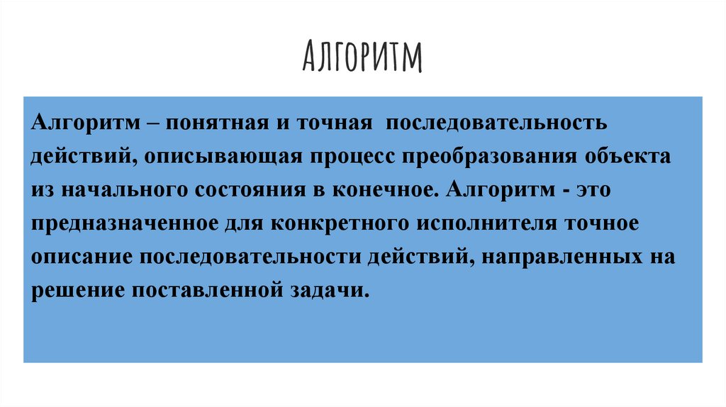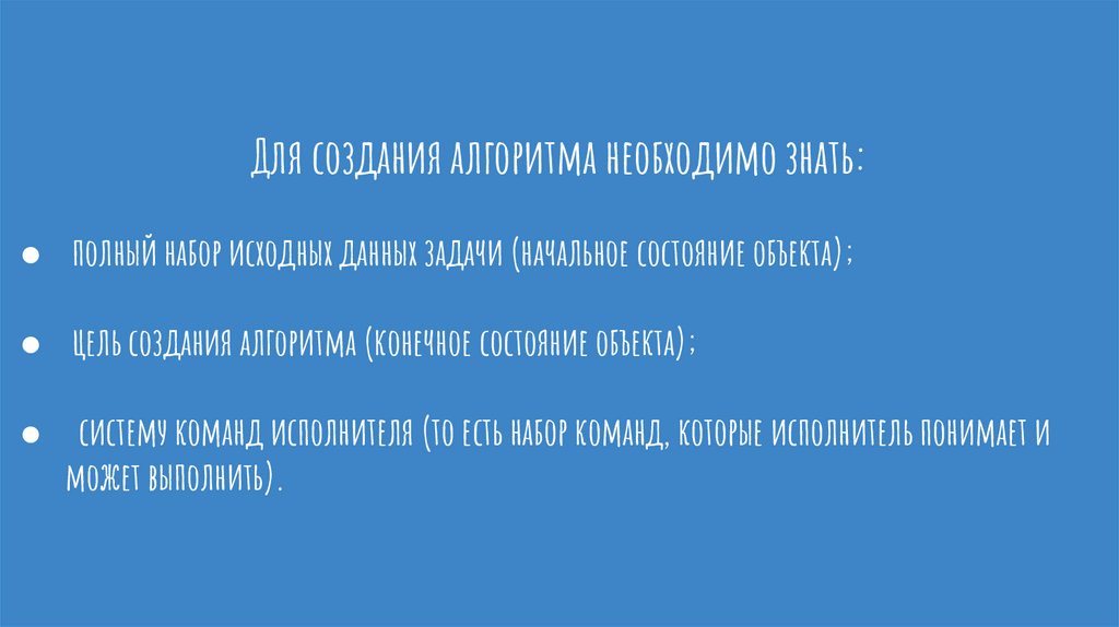 Для создания алгоритма необходимо знать:● полный набор исходных данных задачи (начальное состояние объекта);