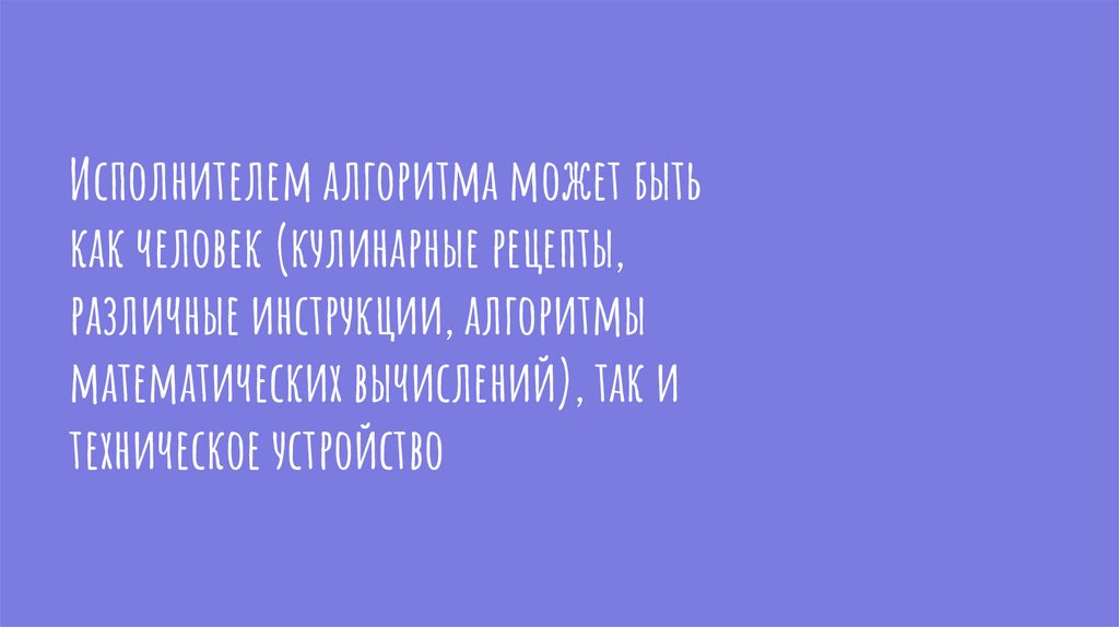 Исполнителем алгоритма может бытькак человек (кулинарные рецепты,