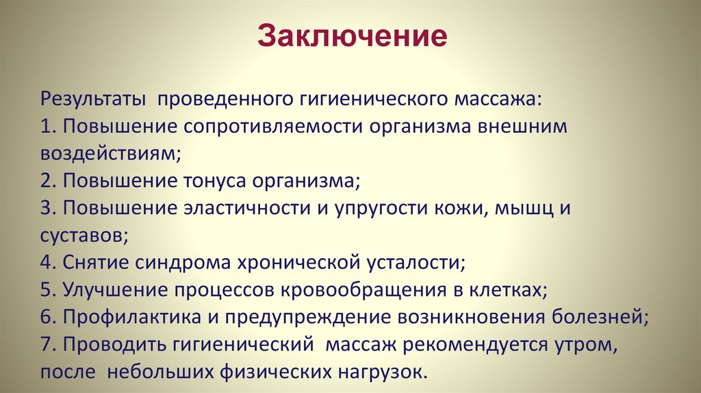 ЗаключениеРезультаты проведенного гигиенического массажа: