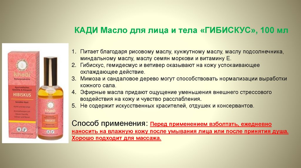КАДИ Масло для лица и тела «ГИБИСКУС», 100 мл1. Питает благодаря рисовому маслу, кунжутному маслу, маслу подсолнечника,