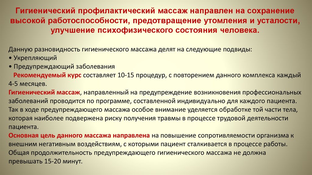 Гигиенический профилактический массаж направлен на сохранениевысокой работоспособности, предотвращение утомления и усталости,