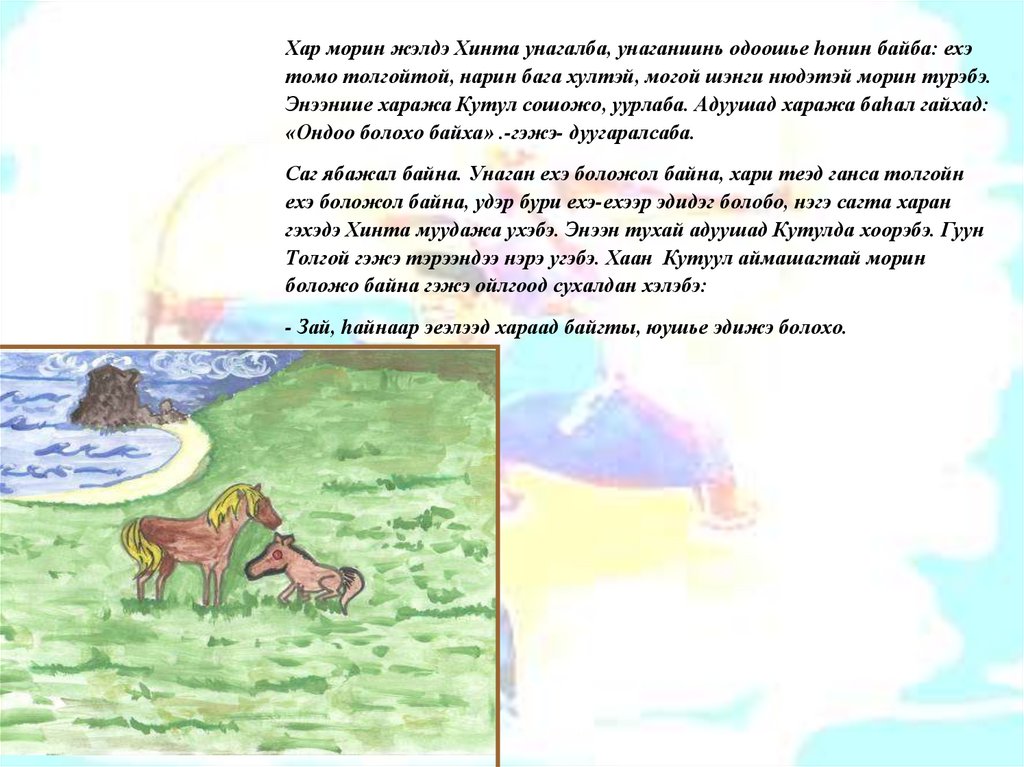 Хар морин жэлдэ Хинта унагалба, унаганиинь одоошье hонин байба: ехэтомо толгойтой, нарин бага хултэй, могой шэнги нюдэтэй морин турэбэ.