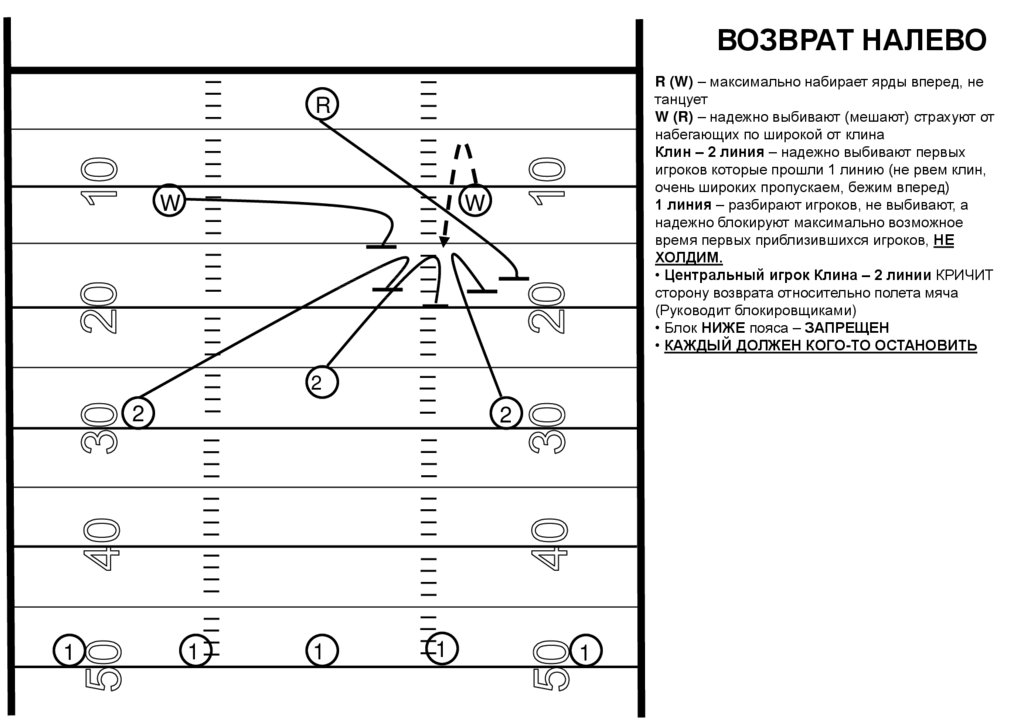 ВОЗВРАТ НАЛЕВОR (W) – максимально набирает ярды вперед, не