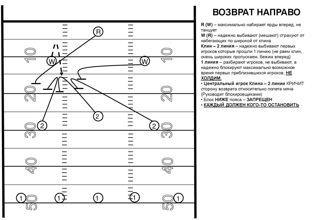 ВОЗВРАТ НАПРАВОR (W) – максимально набирает ярды вперед, не
