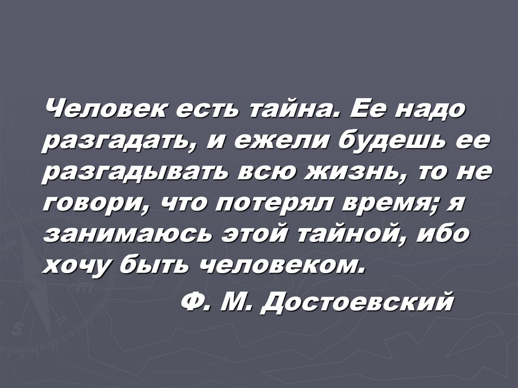 Человек есть тайна. Ее надоразгадать, и ежели будешь ее