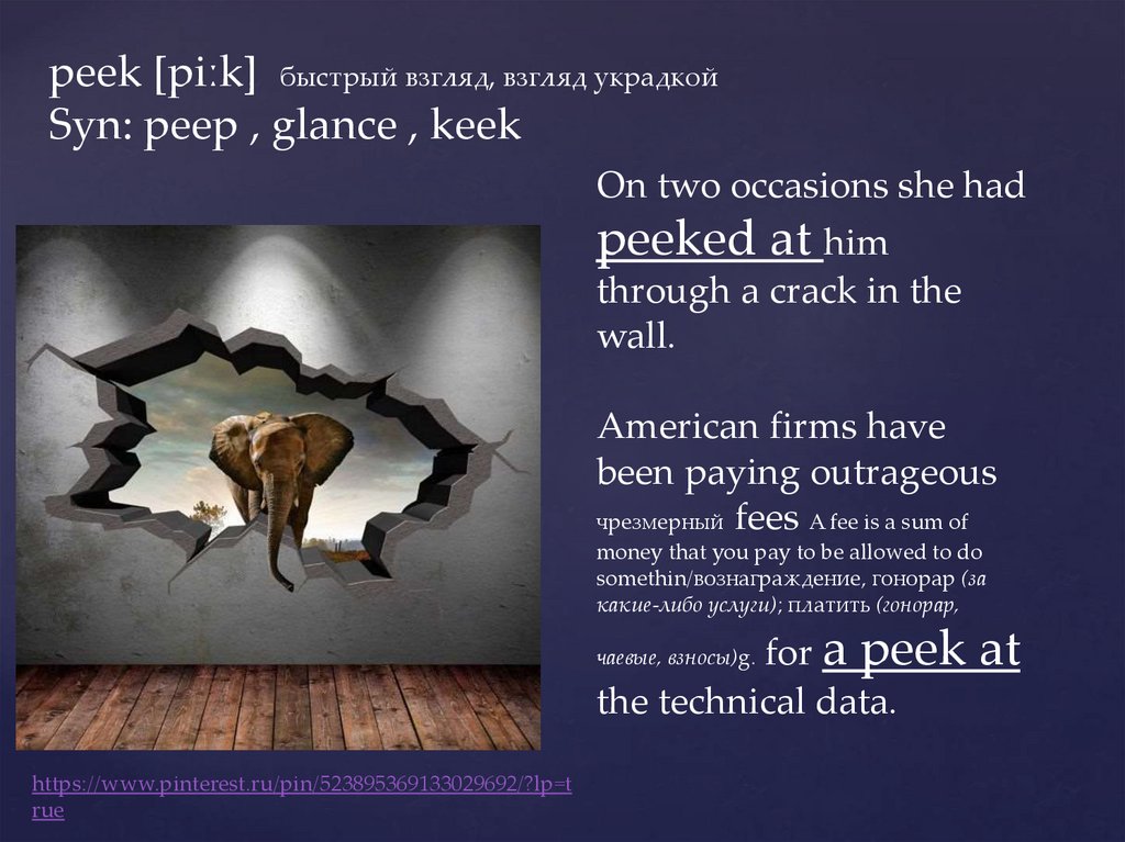 to peek through a bedroomdoor/window — украдкой заглянуть в