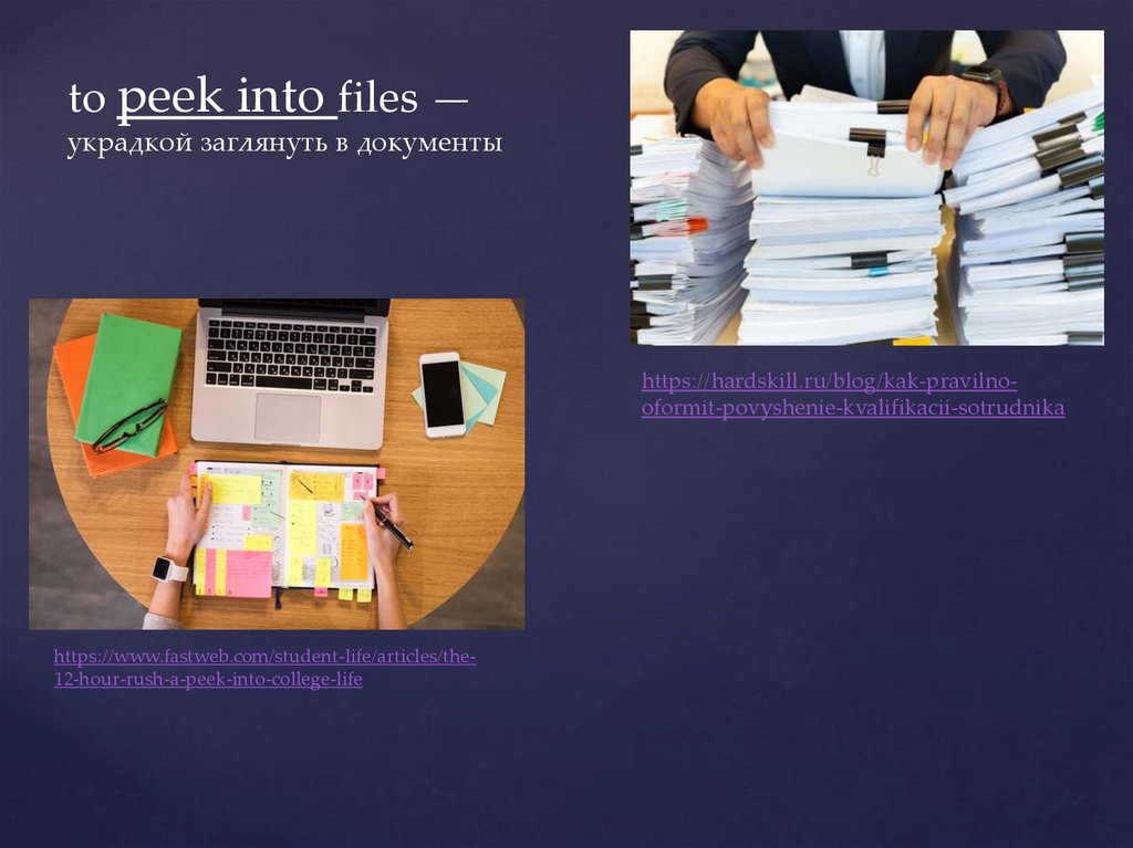 to peek into files —украдкой заглянуть в документы