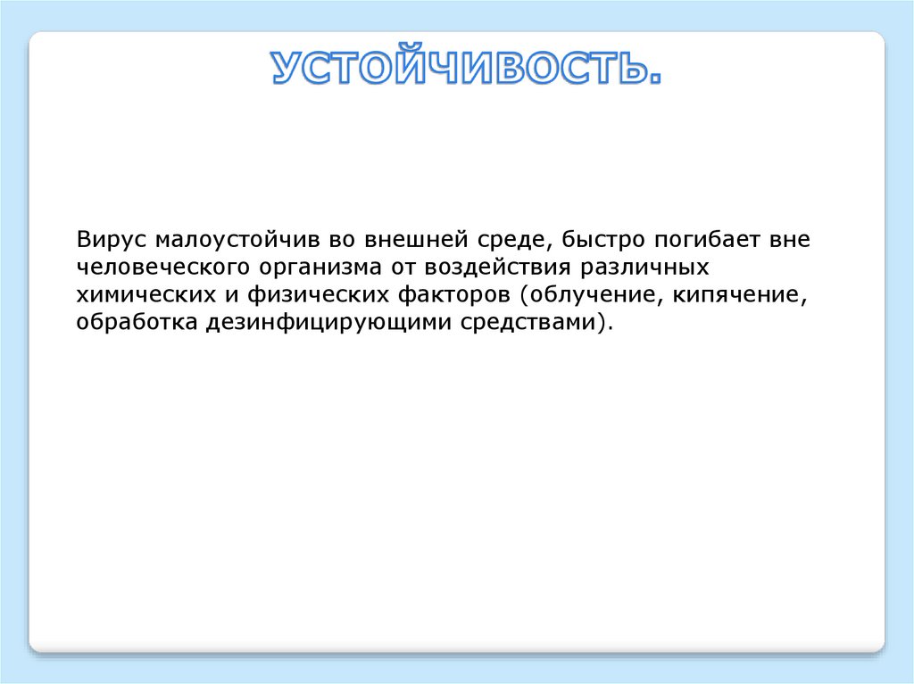 Вирус малоустойчив во внешней среде, быстро погибает внечеловеческого организма от воздействия различных