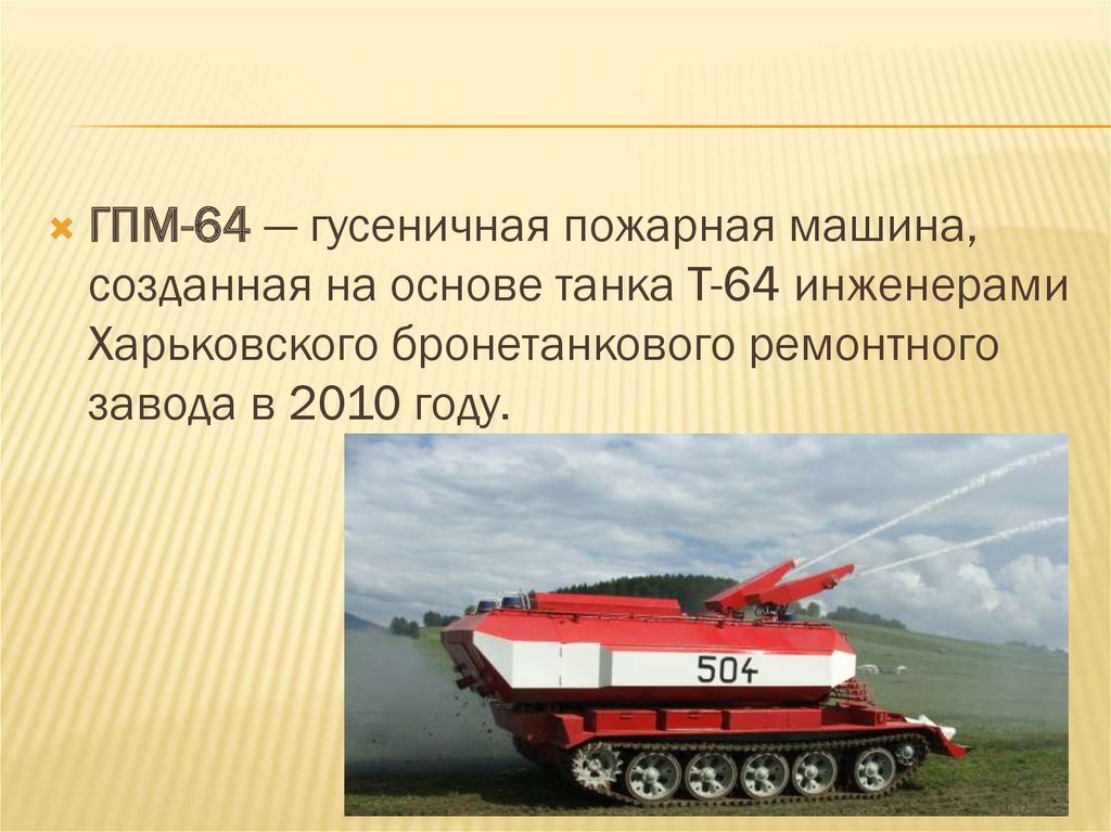 ГПМ-64 — гусеничная пожарная машина,созданная на основе танка Т-64 инженерами