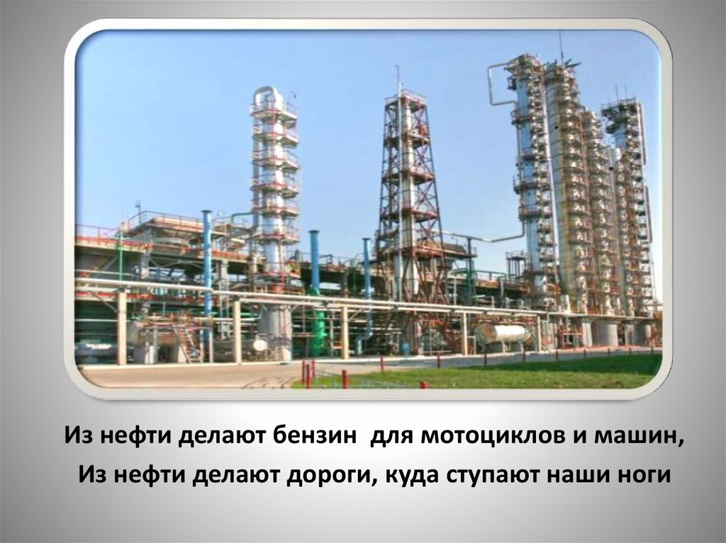 Из нефти делают бензин для мотоциклов и машин,Из нефти делают дороги, куда ступают наши ноги