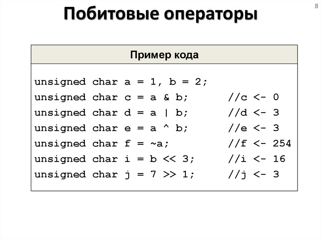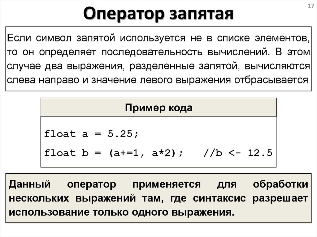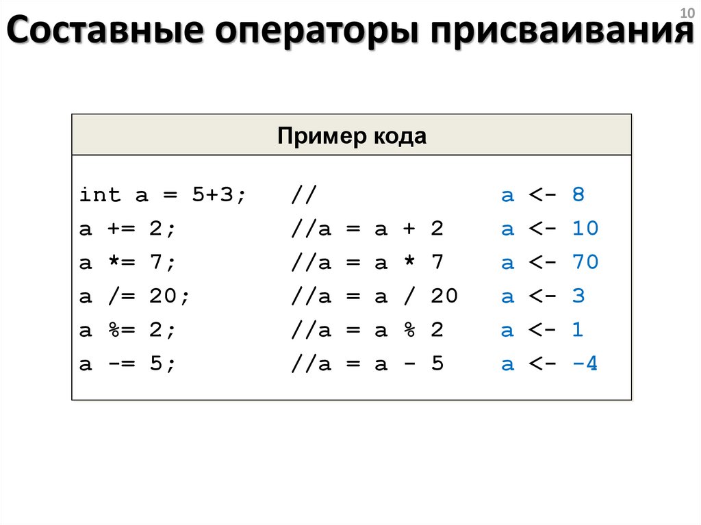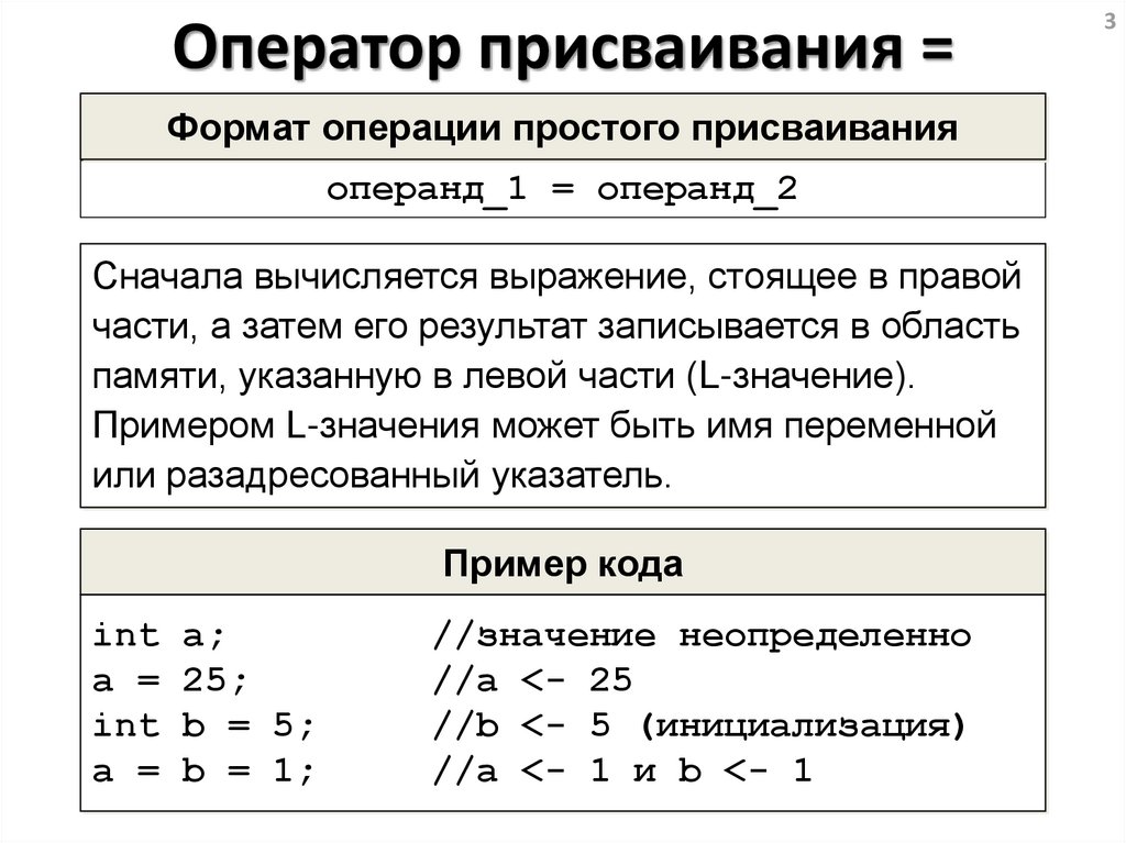 = += –= *= /= %= <<= >>= &= |= ^= Справа налево