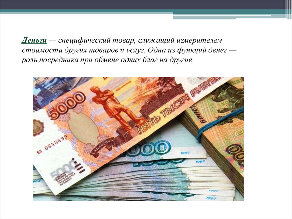 Деньги — специфический товар, служащий измерителемстоимости других товаров и услуг. Одна из функций денег —
