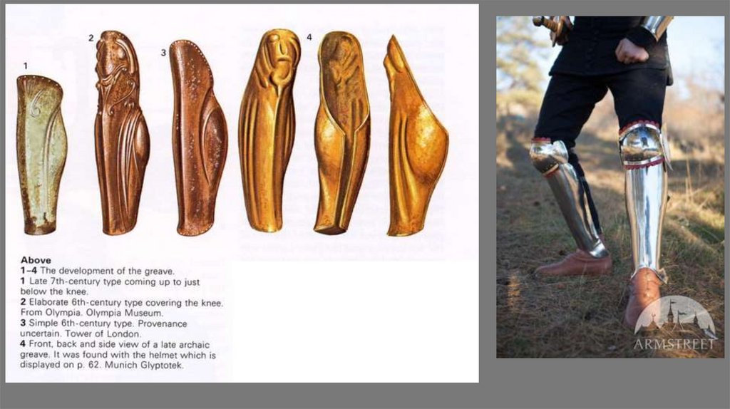 Greaves and vambraces; Brightly burnished vambrace.