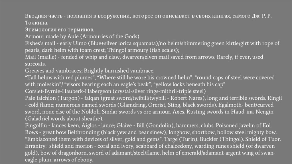Вводная часть - познания в вооружении, которое он описывает в своих книгах, самого Дж. Р. Р.Толкина.