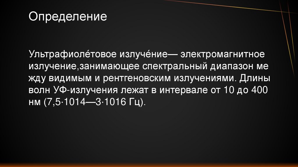 ОпределениеУльтрафиоле́товое излуче́ние— электромагнитное