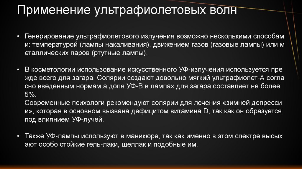Применение ультрафиолетовых волн• Генерирование ультрафиолетового излучения возможно несколькими способам
