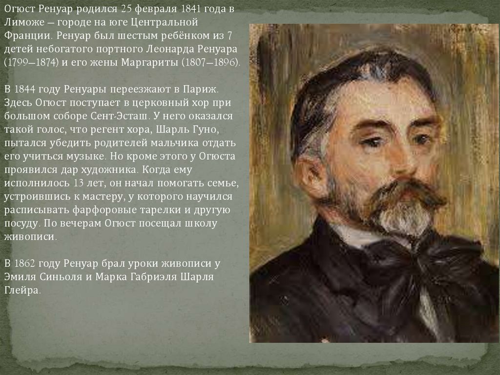 Огюст Ренуар родился 25 февраля 1841 года вЛиможе — городе на юге Центральной