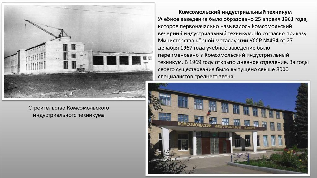 Комсомольский индустриальный техникумУчебное заведение было образовано 25 апреля 1961 года,
