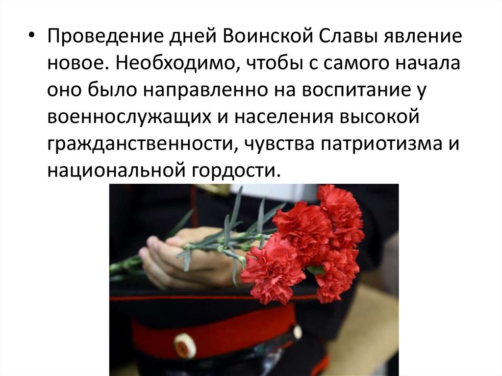 • Проведение дней Воинской Славы явлениеновое. Необходимо, чтобы с самого начала