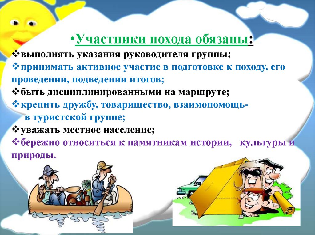 •Участники похода обязаны:выполнять указания руководителя группы;