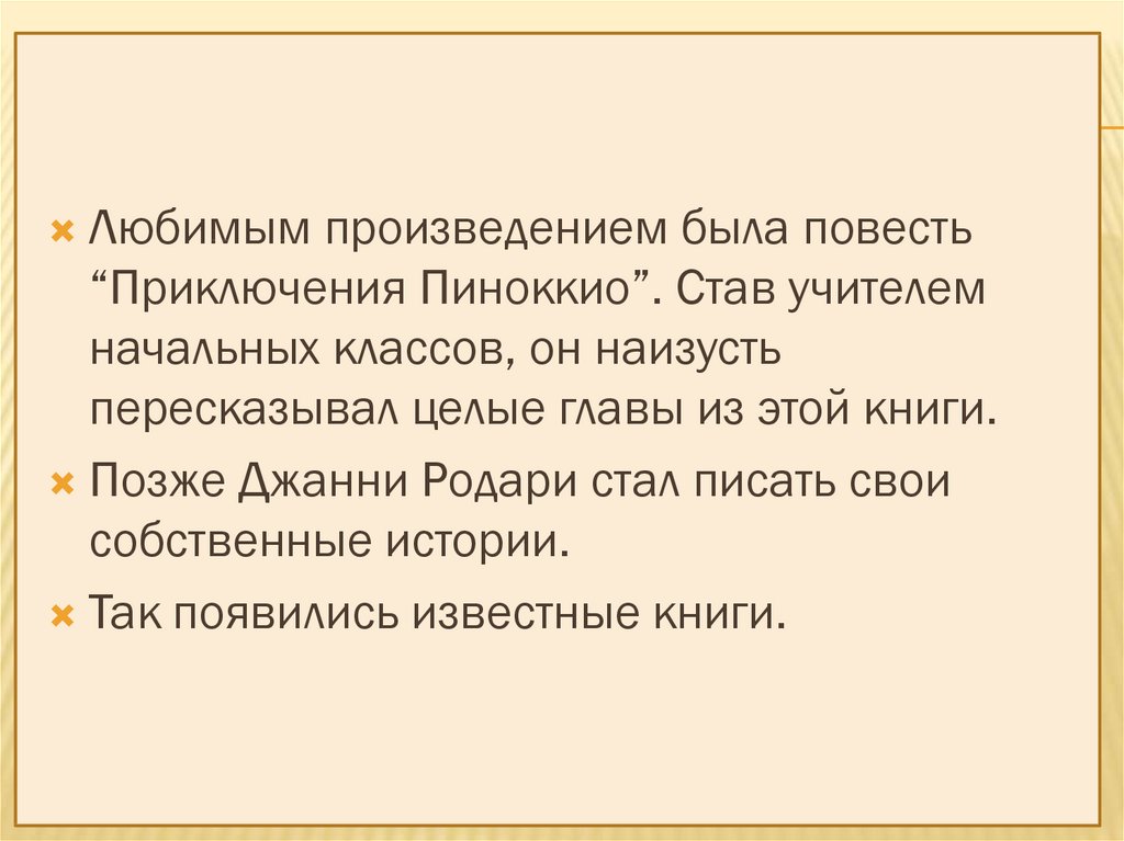 Любимым произведением была повесть“Приключения Пиноккио”. Став учителем