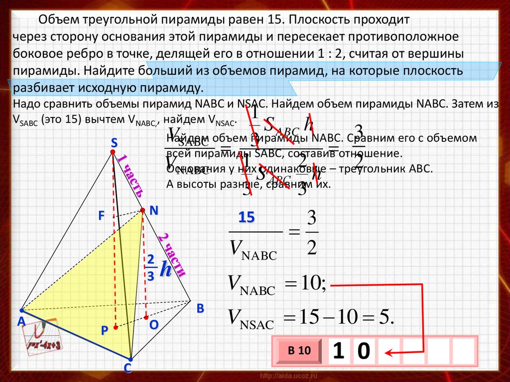 пирамиды. Найдите больший из объемов пирамид, на которые плоскость