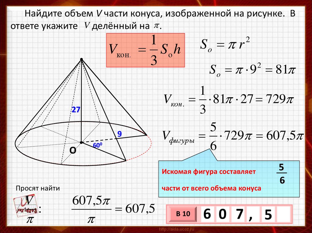 Найдите объем V части конуса, изображенной на рисунке. Вответе укажите V делённый на .