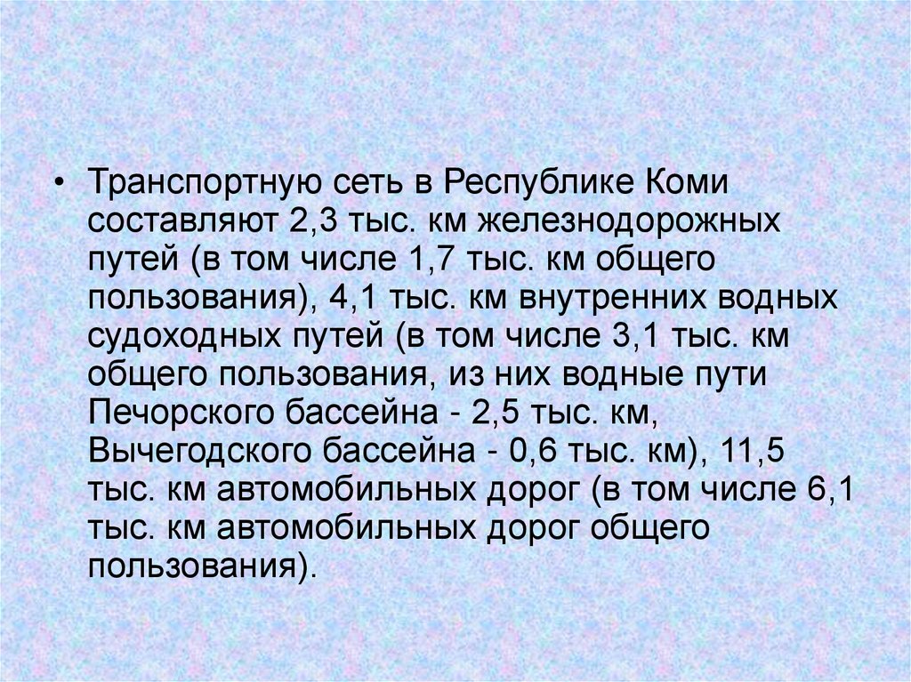 • Транспортную сеть в Республике Комисоставляют 2,3 тыс. км железнодорожных