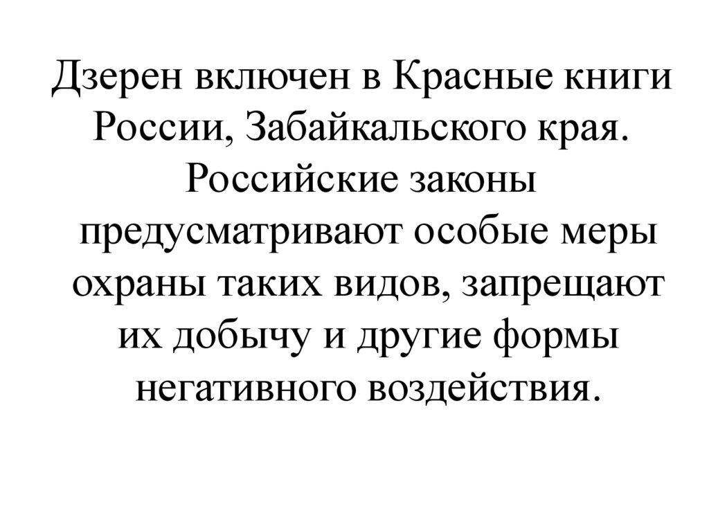 Дзерен включен в Красные книгиРоссии, Забайкальского края.