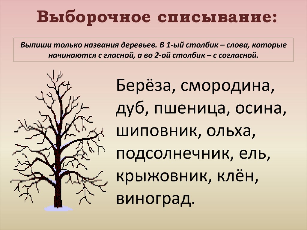 Выборочное списывание:Выпиши только названия деревьев. В 1-ый столбик – слова, которые